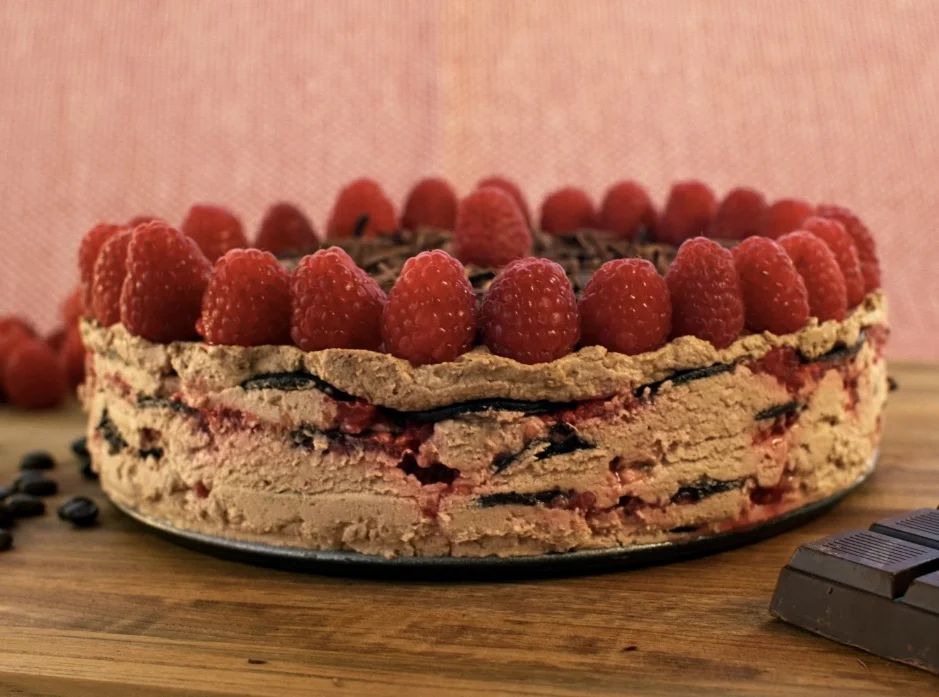 To assemble the icebox cake, use a 8-9-inch springform pan. Line the bottom of the pan with a layer of chocolate wafers. Slightly overlap the wafers to form the layer; if there are any gaps you can break up some of the wafers to fill the holes. Top the layer of chocolate wafers with a quarter of the cream mixture. Top the cream mixture with a third of the raspberry mixture. Add a second layer of chocolate wafers, top with another quarter of the cream mixture, and another third of the raspberry mixture. Add a third layer of chocolate wafers, top with another quarter of the cream mixture, and the last third of the raspberry mixture. Add a final fourth layer of chocolate wafers and top with the remaining cream mixture. Smooth the top layer with an offset spatula, cover with plastic and refrigerate for 8 hours or overnight.