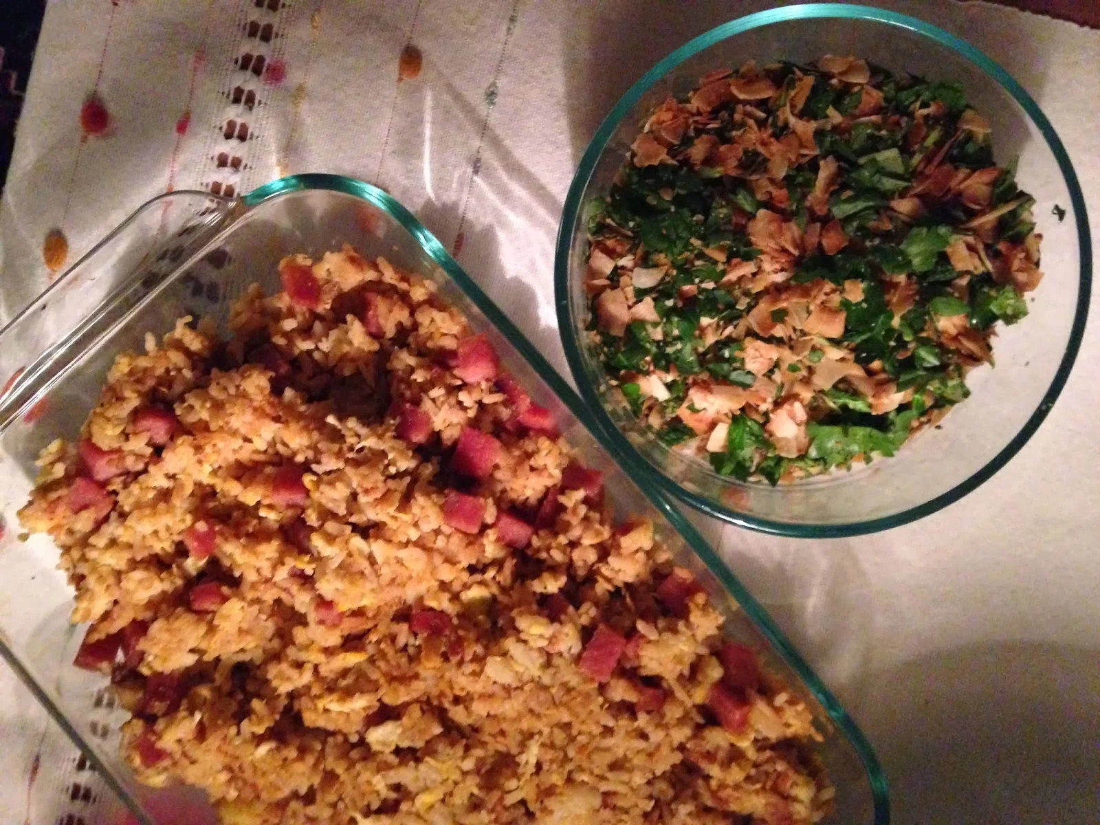 Spam fried rice with toasted coconut and herb topping on the side (the topping is such a good idea, I'll be stealing that for the future)