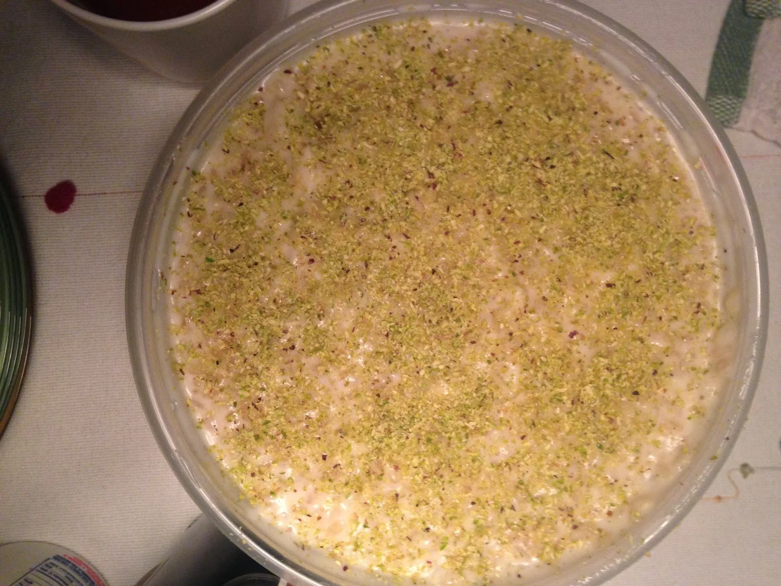 Coconut milk brown rice pudding topped with ground pistachios, served with macerated cherries and whole pistachios