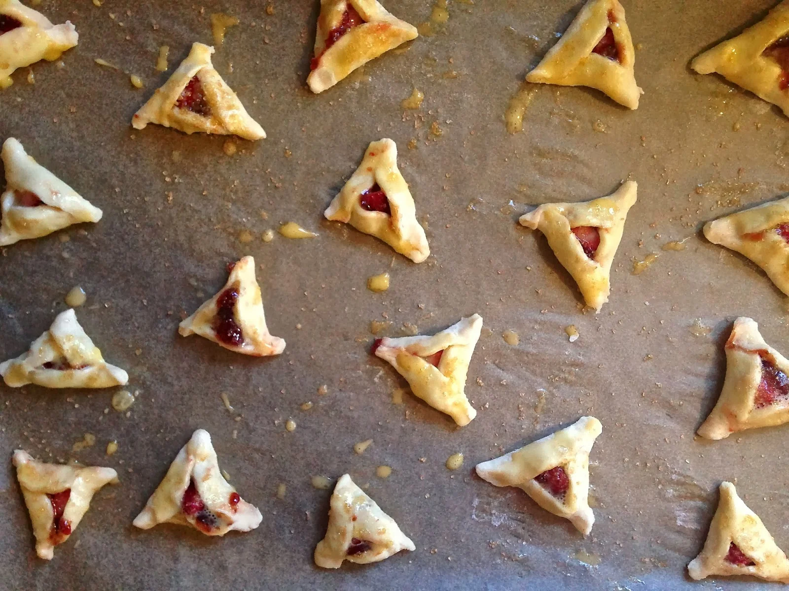You can also use this dough for hamantaschen. Preheat the oven to 350°F. Cut the dough into rounds using a biscuit cutter or water glass. Fill each circle of dough with a small spoonful of jam or your favorite filling. Pinch the sides upward to form a triangle shape, pinch each side closed. Place the dough on a parchment-lined baking sheet and freeze or chill for a minimum of 15 minutes. Bake for 15-17 minutes or until firm to the touch and just golden at the edges.