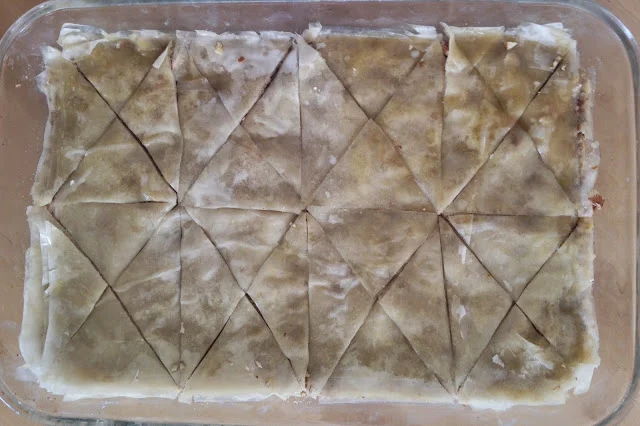 9. Cut the phyllo before placing it in the oven. Make sure the knife goes through every layer. It's very important to cut at this stage because after it's baked the phyllo will become crumbly, paper thin, and difficult to cut cleanly. Here is how I cut mine: