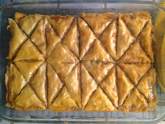 2. Let the finished baklava rest at room temp for at least 8 hours or overnight. The longer it sits the better... it needs time to soak up the syrup.