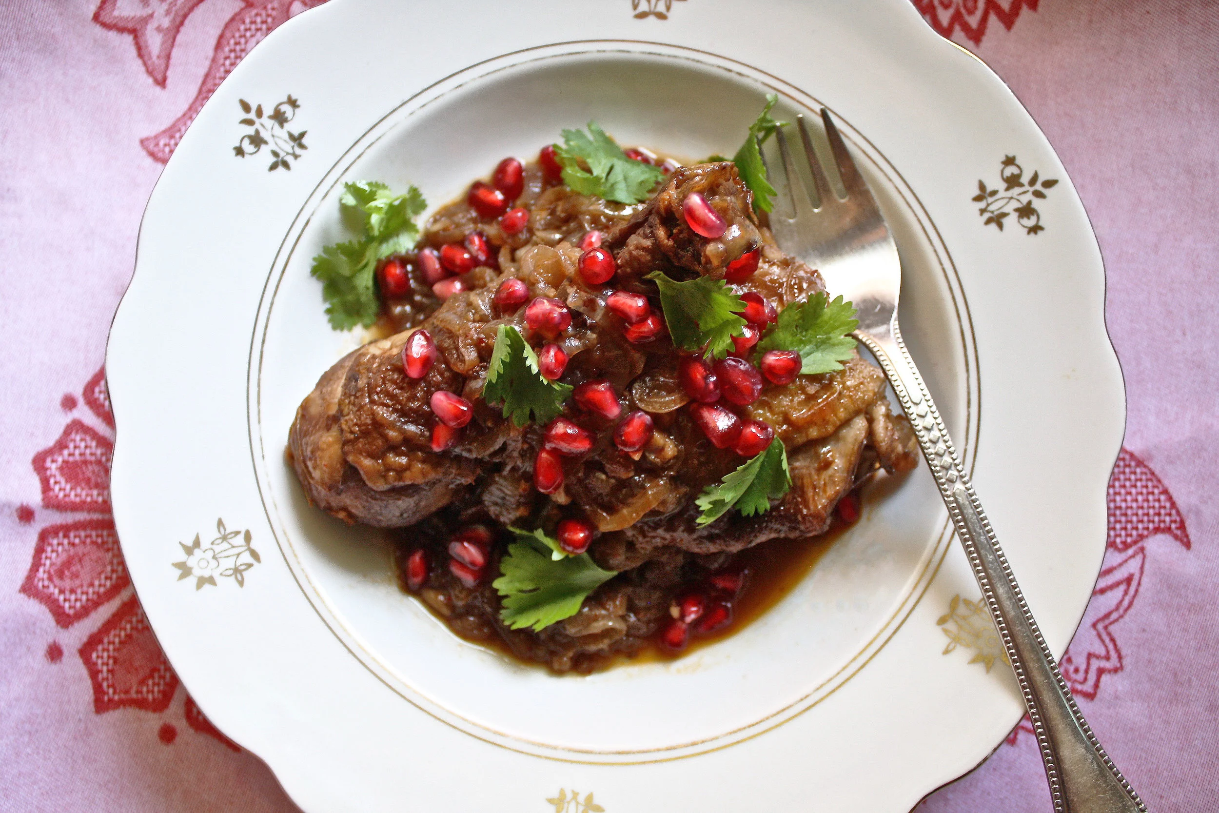 As documented by the queen of Jewish cooking, Joan Nathan, and by Georgian food guru, Carla Capalbo, the Georgian Jewish community traditionally makes chicken cooked in pomegranate juice for Rosh Hashanah. It’s a perfect recipe for the High Holidays: sweet, tart, flavorful, and eye-catching. This recipe is an adaptation from multiple recipes for this dish, but in any variation the chicken is braised in a generously-spiced, fruity pomegranate juice-based broth, and then topped with fresh red jewel-like pomegranate kernals.