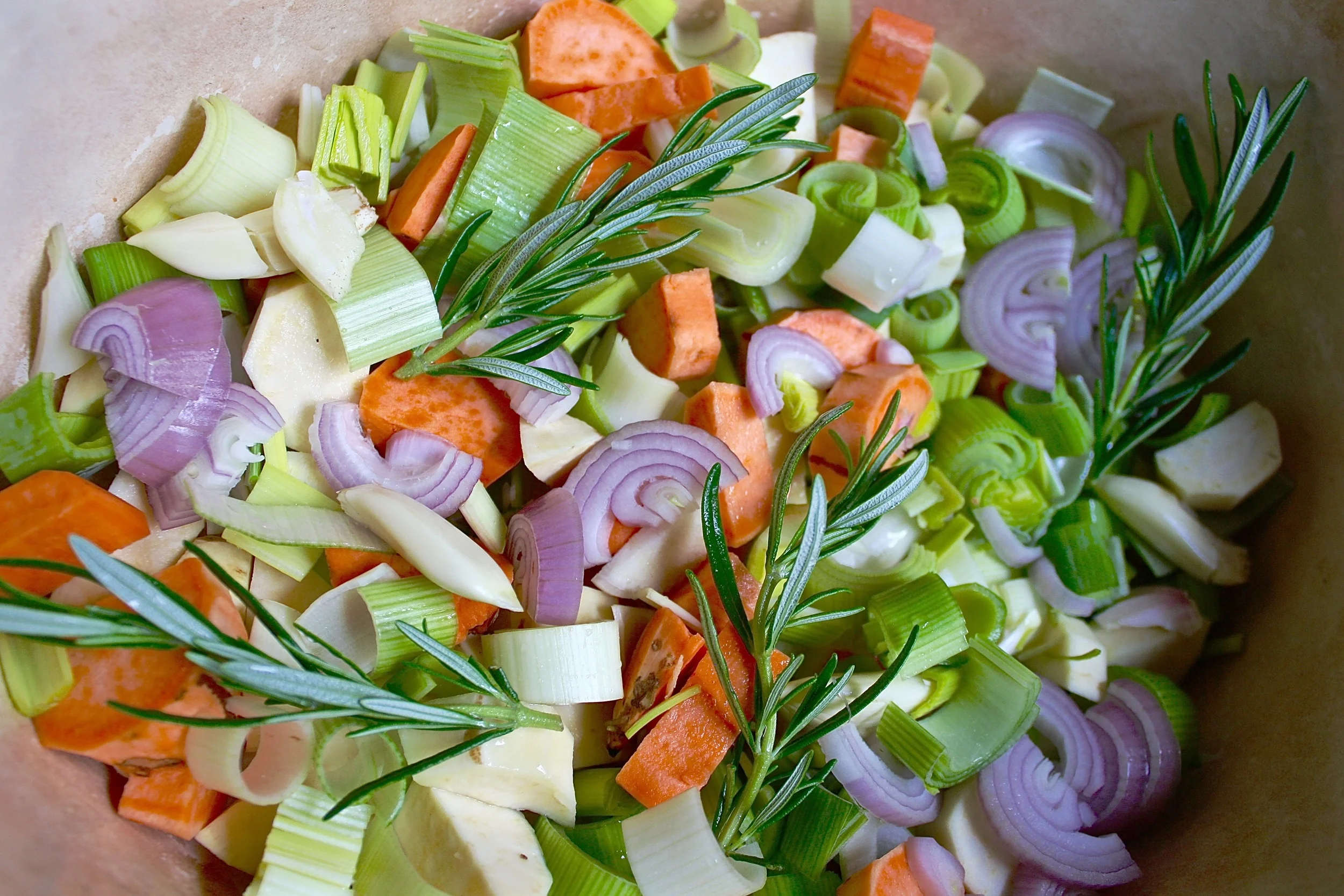 To a pot add the chopped sweet potato, leeks, shallot, smashed garlic, and whole springs of fresh Rosemary (the leaves will come off the stems as everything cooks. Season lightly with salt and pepper.