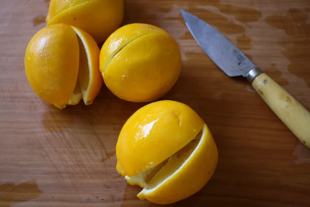 Quarter each lemon by slicing the top down within half an inch of the bottom, leaving them connected. Pack salt into the lemon then press it back into its original shape.